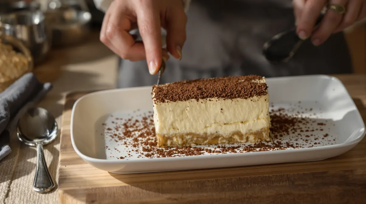 Lissez soigneusement le dessus. Ce geste simple donne immédiatement un aspect plus net et plus gourmand. Votre tiramisu maison est déjà très tentant, mais il lui manque une dernière étape essentielle.